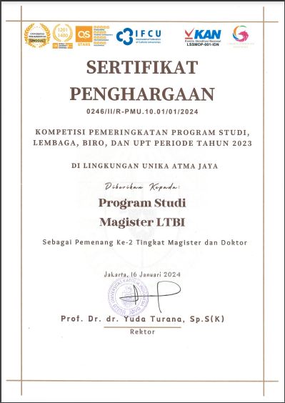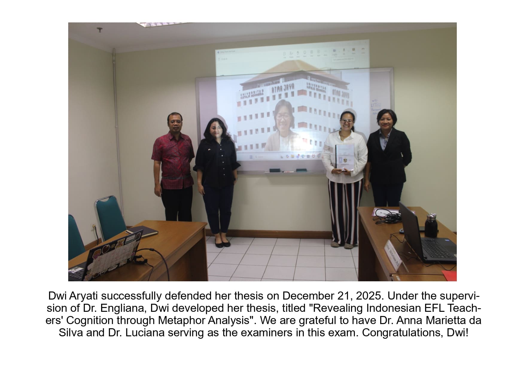 My two-year study at the Master program of Applied English Linguistics at Atma Jaya Catholic University of Indonesia has been a wonderful and fruitful academic journey, during which I have gained abundant knowledge that has greatly benefitted my career as an English teacher and a language practitioner. Not only have I learned essential theoretical concepts of the language, but the program has also equipped me with plethora of practical insights that I can implement in various fields of work, such as translation, discourse analysis, and English for Specific Purposes. All the lecturers undeniably possess profound knowledge in their respective areas of interest and always strive to provide cutting-edge information and input in my exploration of the discipline. I can confidently testify that joining this program has enabled me to enhance my expertise as a language specialist, allowing me to take more professional opportunities and expand my networking. Come join us and witness more doors of opportunities opening for you ahead in your career.