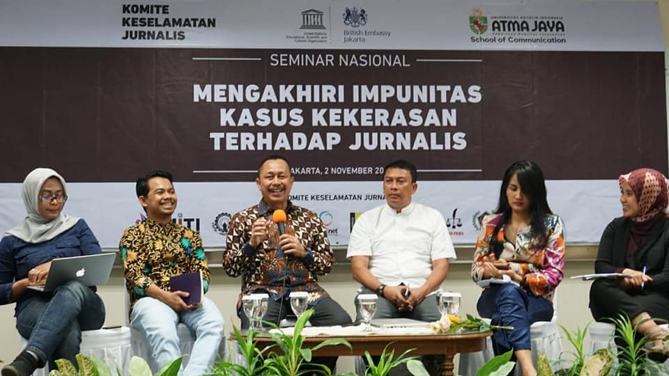 Program Studi Ilmu Komunikasi Unika Atma Jaya yang bekerja sama dengan Komite Keselamatan Jurnalis mengadakan kegiatan seminar dalam rangka memperingati hari internasional anti impunitas terhadap kasus kekerasan terhadap jurnalis. Seminar ini didukung pula oleh Kedutaan Besar Inggris di Indonesia dan UNESCO. Seperti kita ketahui bahwa pers merupakan pilar keempat dari demokrasi, namun demikian, ancaman terhadap para pewarta di berbagai belahan dunia terus meningkat. Mereka menjadi tidak aman dalam menjalankan tugasnya. Ancaman terhadap para pewarta ini dalam skala besar nantinya bahkan bisa mengancam keberadaan demokrasi itu sendiri. Banyak pemimpin negara yang dipilih secara demokratis, pada akhirnya pelan namun pasti, berubah menjadi otoriter. Ini karena peran pers yang tidak cukup kuat untuk mengawasinya.