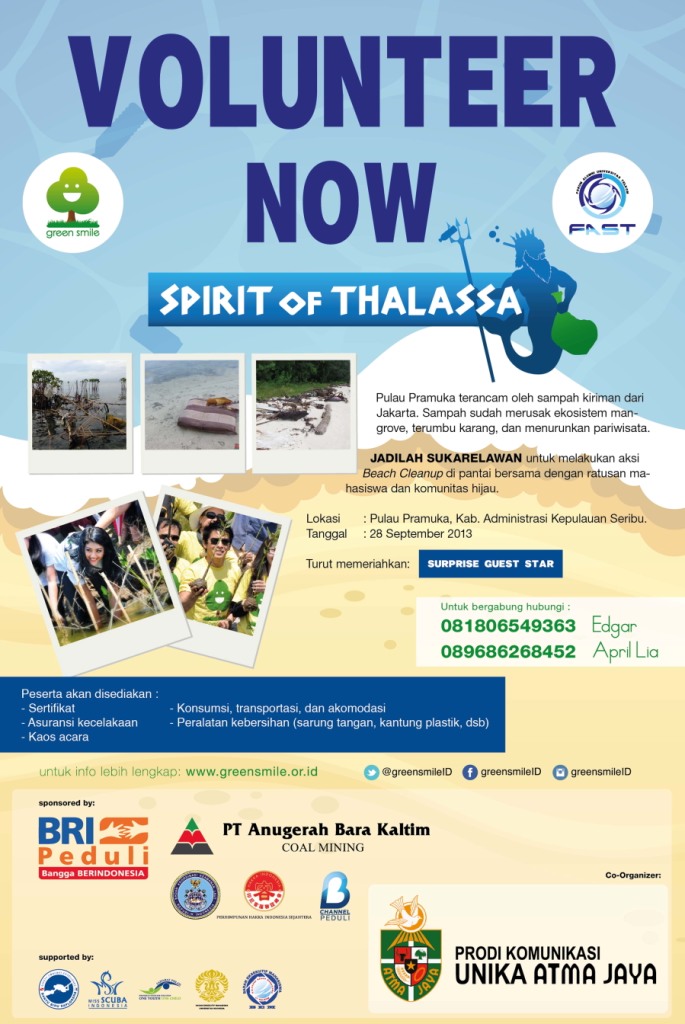 Mahasiswa Prodi. Komunikasi, Unika Atma Jaya, Jakarta, turut ambil bagian menjadi volunteer sekaligus menjadi Co-Organizer untuk wilayah Jakarta Selatan. Aksi pembersihan pantai akan diselenggarakan pada;