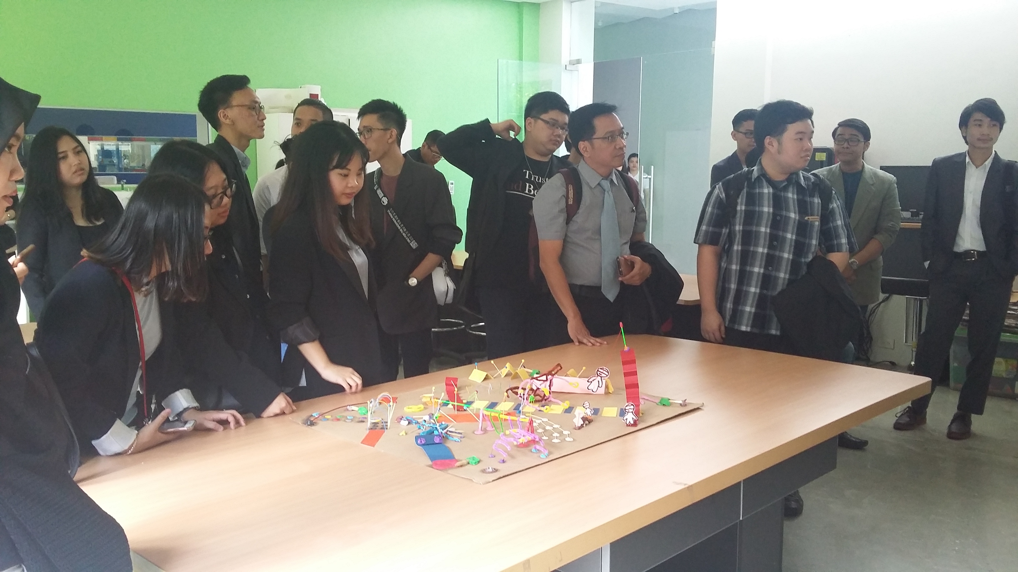 Di bagian awal, mahasiswa FIABIKOM Unika Atma Jaya diajak berkeliling untuk melihat dan merasakan segala fasilitas yang ada. Setelah itu mahasiswa mendapatkan kuliah tentang Design Thinking di Performace Lab. Secara ringkas dalam kuliah ini, mahasiswa dibagi ke dalam beberapa kelompok, dan masing-masing kelompok diminta untuk membuat suatu produk berdasarkan material yang telah diberikan. Setelah itu mereka harus mempresentasikan produk yang dibuat untuk mendapatkan masukan dari mahasiswa lain dan juga para dosen yang hadir.