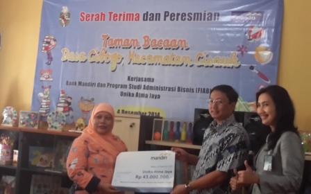 Pada tanggal 4 Desember 2014 telah dilakukan peresmian taman bacaan di Desa Cibogo, Cisauk, Tangerang. Taman Bacaan ini merupakan salah satu program CSR Bank Mandiri dan Pengabdian Masyarakat Prodi Administrasi Bisnis, Unika Indonesia Atma Jaya. Upacara peresmian ini dihadiri oleh Ibu Aland Rinny Patitty sebagai Area Manager Mandiri Jakarta Sudirman Bank Mandiri dan Dr. A. Prasetyantoko selaku Dekan FIABIKOM Unika Indonesia Atma Jaya dan tim pengabdian Prodi Administrasi Bisnis. Taman Bacaan hasil kerjasama antara Bank Mandiri dan Prodi Administrasi Bisnis Unika Indonesia ini diharapkan dapat menumbuhkan minat baca di kalangan anak-anak dan juga menumbuhkan kesadaran di kalangan orangtua, terutama para ibu, tentang arti penting membaca dan bahkan mendongeng.