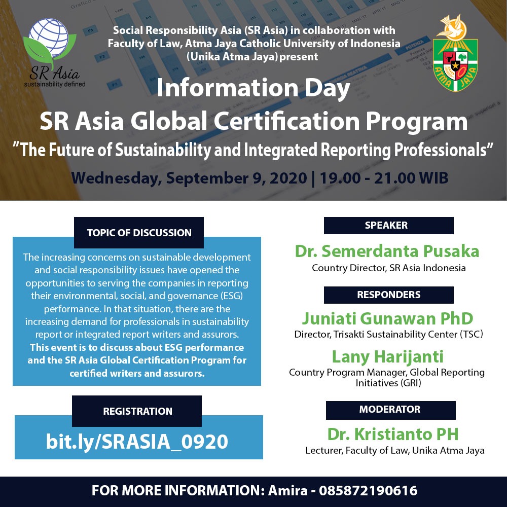 Fakultas Hukum mengadakan kerjasama Antara Fakultas Hukum Unika Atma Jaya Dengan Social Responsibility Asia (SR Asia) dengan diadakan nya Information Day SR Asia Global Certification dengan tema " The Future of Sustainbility and Integrated Reporting Professionals" pada :