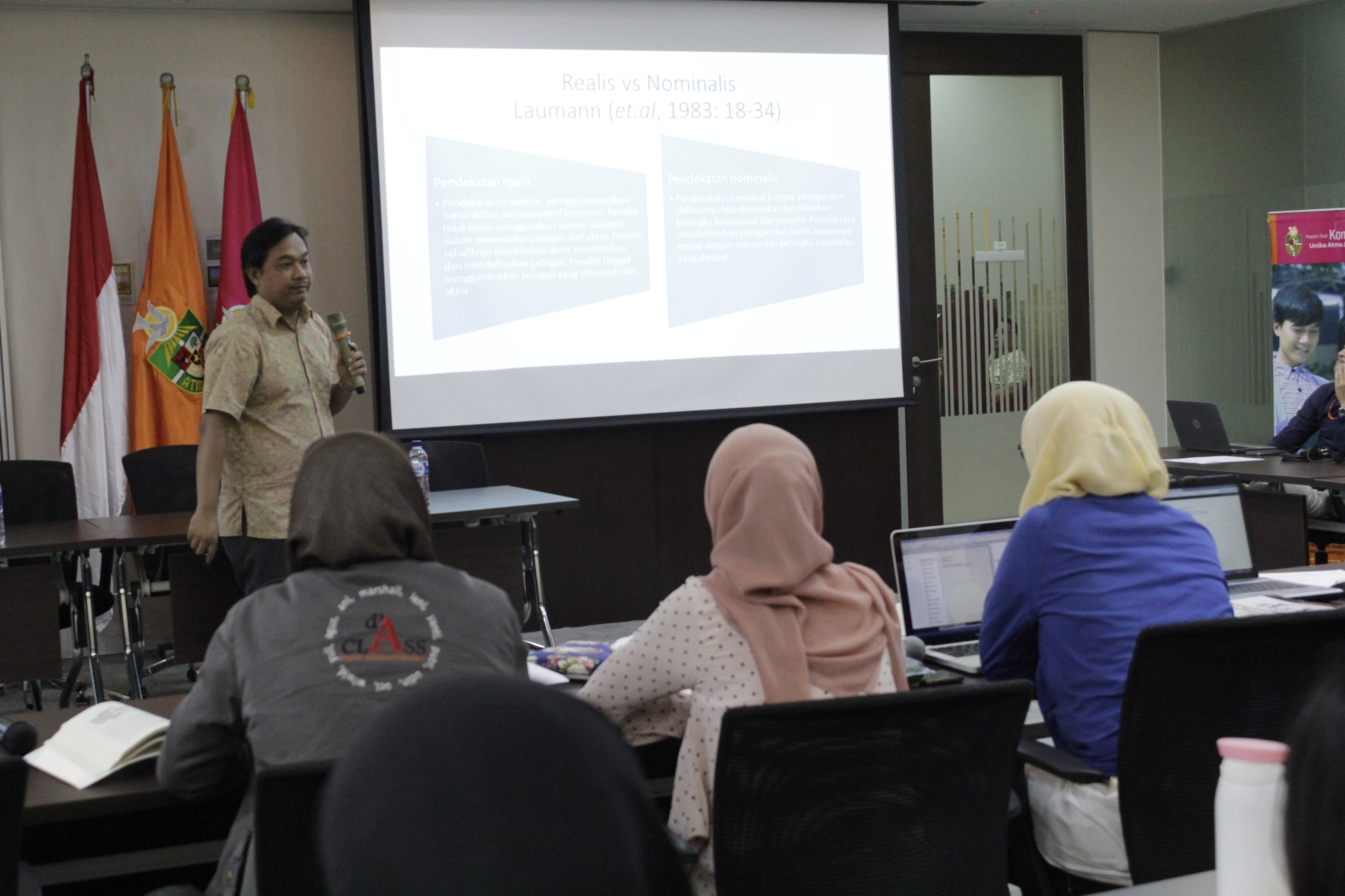 Untuk itulah maka pada tahun ini, Program Studi Ilmu Komunikasi Unika Atma Jaya mengadakan acara Metode Penelitian Komunikasi yang mengambil topik tentang Analisis Jaringan Komunikasi. Adapun sebagai nara sumber dalam kegiatan loka karya ini adalah Dr. Eriyanto yang merupakan penulis buku “Analisis Jaringan Komunikasi: Strategi Baru dalam Penelitian Ilmu Komunikasi dan Ilmu Sosial Lainnya”. Acara ini diselenggarakan di Gedung Yustinus lantai 13 Unika Atma Jaya dan berlangsung pada hari Kamis, 23 Maret 2017. Lokakarya ini dihadiri oleh berbagai ilmuwan komunikasi yang berasal dari berbagai perguruan tinggi yang sangat tertarik untuk mengetahui bagaimana sebenarnya analisis jaringan komunikasi tersebut. (Eko Widodo)