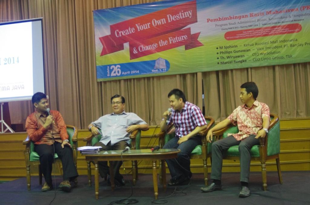 Bertempat di gedung Yustinus lantai 15, pada tanggal 26 April 2014, diselenggarakanlah acara Oepening Pembimbingan Karier Mahasiswa (PKM) ke V dan Closing PKM IV. Acara kali ini mengambil tema “Create Your Own Destiny & Chang the Future”. Kegiatan ini diselenggarakan oleh ketiga prodi si lingkungan Fakultas Ilmu Administrasi Bisnis dan Ilmu Komunikasi Unika Atma Jaya. PKM ini dimaksudkan untuk membantu mahasiswa Unika Atma Jaya dalam mempersiapkan diri memasuki dunia kerja maupun berwirausaha. Selain itu kegiatan yang melibatkan alumni ini juga dimaksudkan untuk sedari awal fakultas dengan dibantu beberapa alumni bisa memberikan pendampingan dalam berkarier dan mengembangkan usaha.