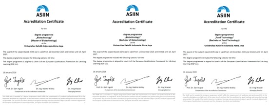 Pada tanggal 16 Januari 2026, Program Studi Bioteknologi, Teknologi Pangan, & Magister Bioteknologi dari Fakultas Biosains, Teknologi, dan Inovasi, Unika Atma Jaya memperoleh Akreditasi Internasional Accreditation Agency for Degree Programs in Engineering, Informatics, Natural Sciences, & Mathematics (ASIIN). Secara komprehensif, akreditasi ini menilai berbagai aspek mulai dari kurikulum, kualitas staff pengajar, kualitas lulusan, fasilitas program studi, kesempatan beasiswa, serta sistem penunjang kegiatan pembelajaran di universitas. Berdasarkan hasil yang membanggakan ini, ke-3 program studi yang sudah terakreditasi ini dapat dikatakan setara dengan kualitas pendidikan tinggi taraf internasional & tidak kalah saing dengan program studi sejenis dari universitas swasta dan negeri lainnya.