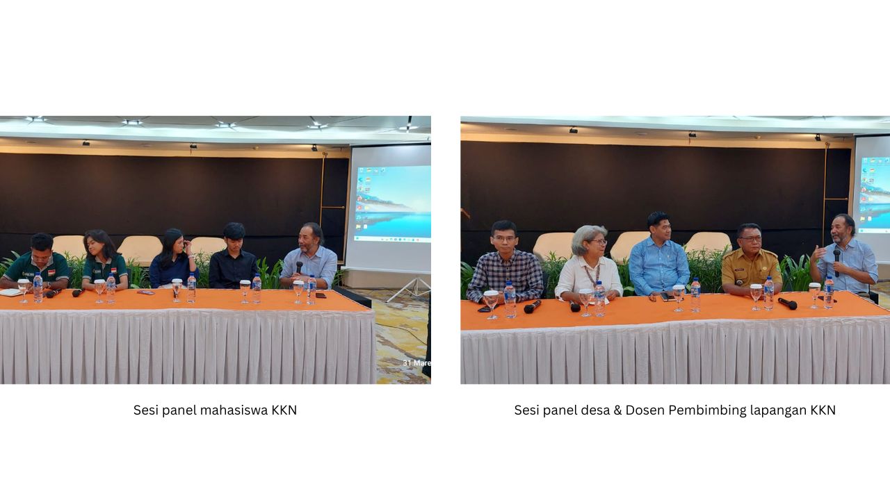 Sesi pertama menghadirkan panel mahasiswa yang diwakili oleh Almendo Patar dan Angelica Putri Arista (Desa Ponggang), serta Stephen Andhika Bagaskara dan Michelle Patia Lumbanraja (Desa Pantai Bahagia). Para mahasiswa berbagi pengalaman selama pelaksanaan KKN, termasuk berbagai hambatan dan solusi yang ditemui. Khusus untuk pelaksanaan KKN di Desa Pantai Bahagia, disampaikan pentingnya perhatian lebih terhadap aspek keamanan transportasi selama kegiatan berlangsung.