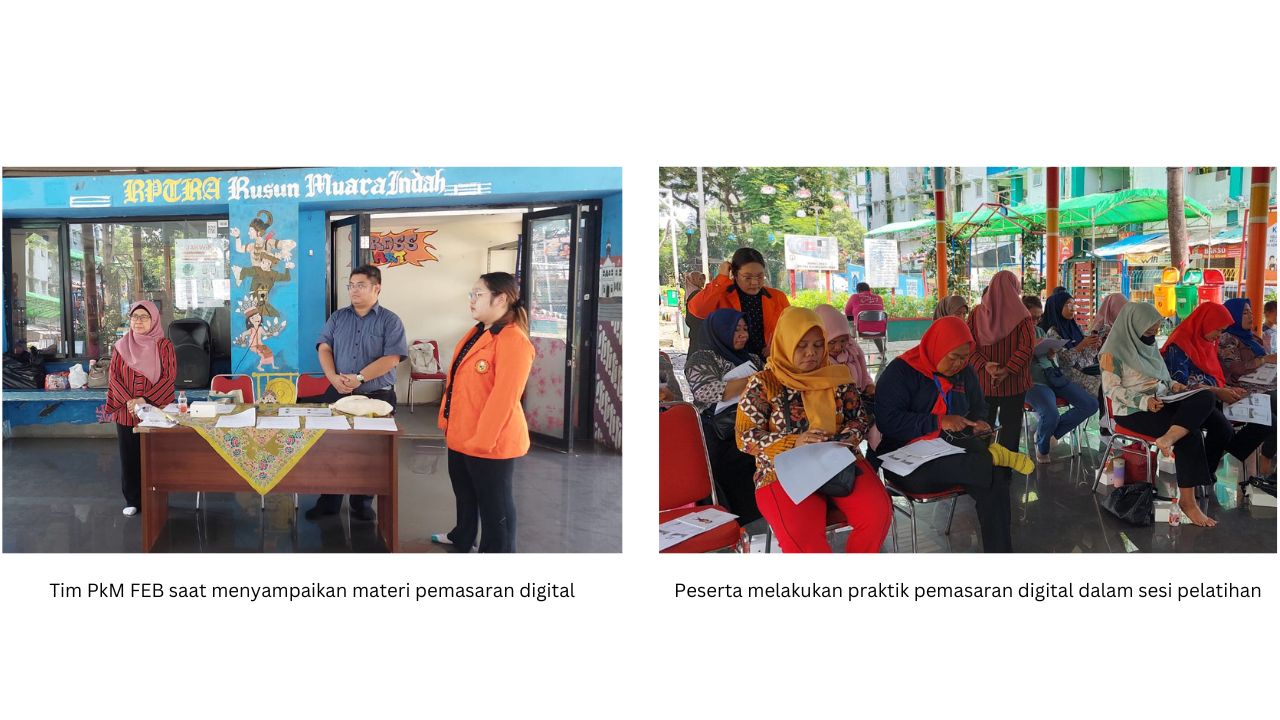 Pusat Pemberdayaan Masyarakat (PPM) Unika Atma Jaya kembali memfasilitasi dan mendampingi kegiatan Pengabdian kepada Masyarakat (PkM) yang kali ini dilaksanakan oleh Tim PkM Fakultas Ekonomi dan Bisnis (FEB) di Ruang Publik Terpadu Ramah Anak (RPTRA) Rusun Muara Indah, Waduk Pluit. Kegiatan ini berlangsung dua kali, yaitu pada 24 September 2025 dan 26 November 2025, dengan fokus pada peningkatan kapasitas masyarakat dalam pemasaran digital dan edukasi investasi.