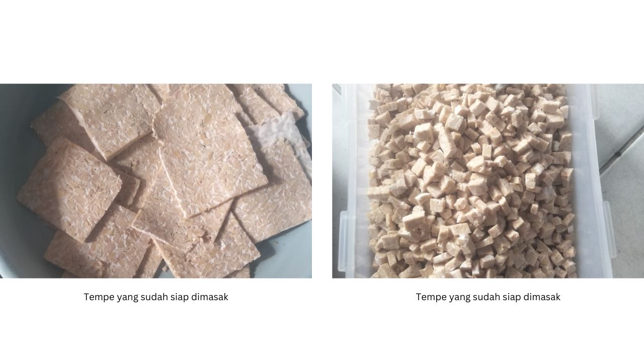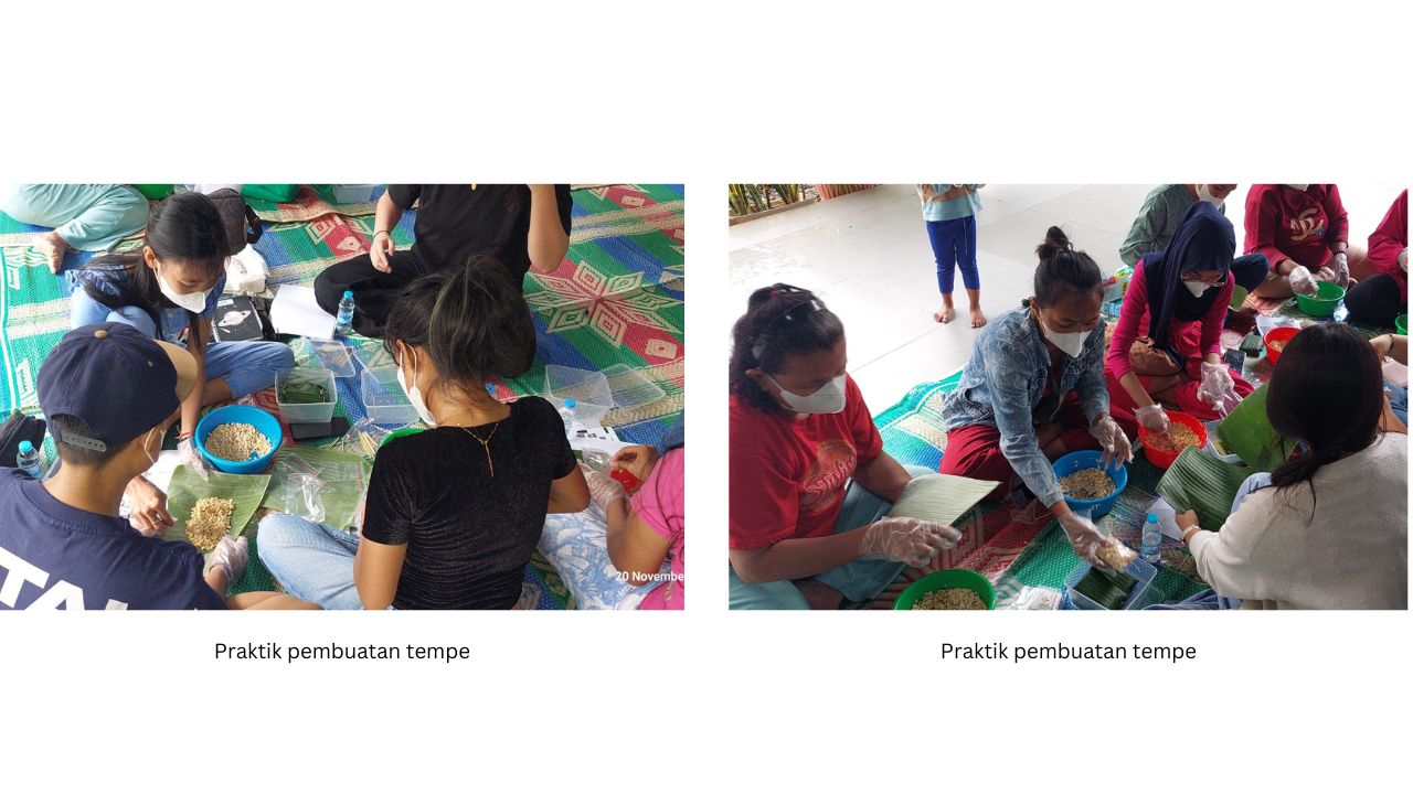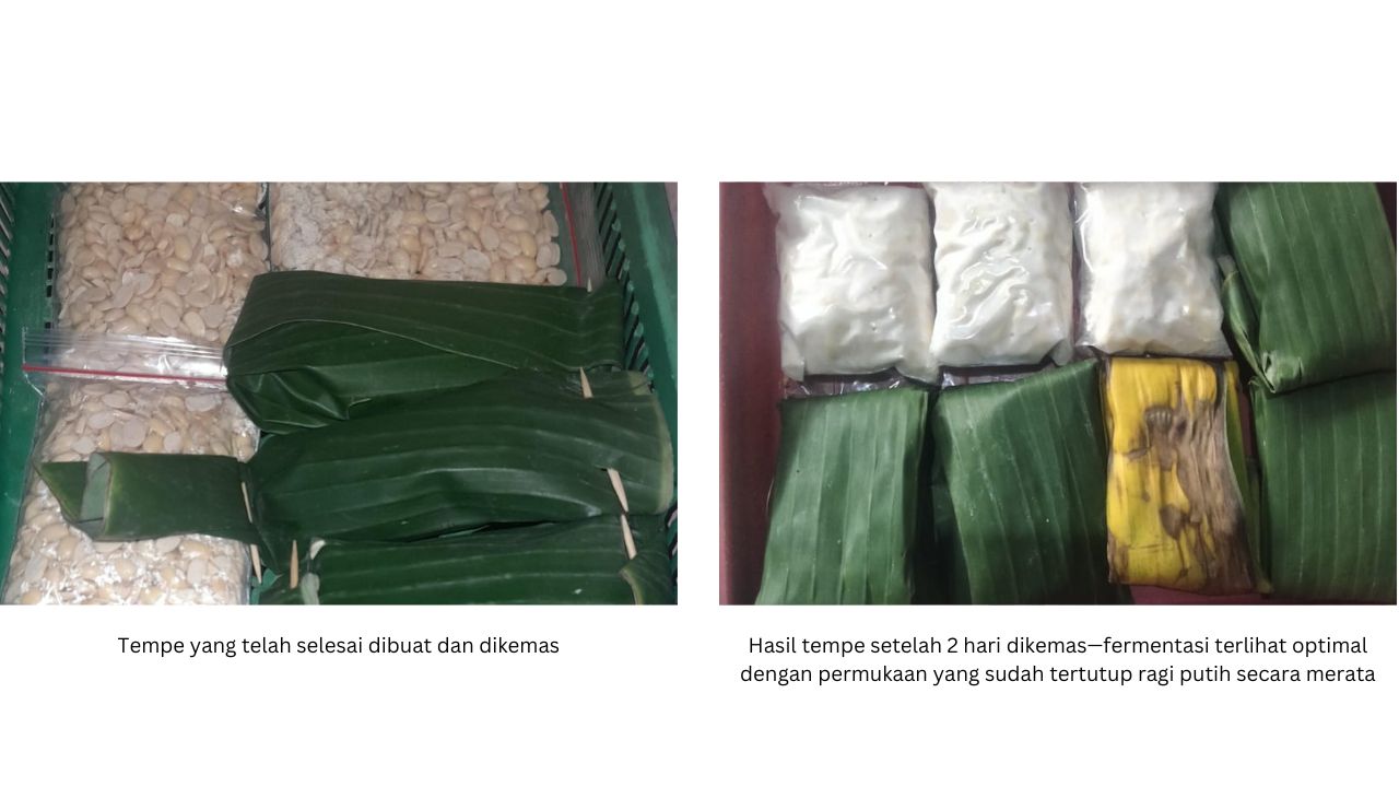 Selanjutnya, peserta mengikuti praktik langsung pembuatan tempe higienis menggunakan prosedur sederhana berbasis bioteknologi. Dengan pendampingan mahasiswa, peserta menyiapkan dan memproses bahan hingga tahap fermentasi awal. Tempe yang telah diproses dibawa pulang menggunakan boks plastik yang disediakan, dan setelah disimpan selama dua hari, tempe sudah dapat dimasak dan dikonsumsi.
